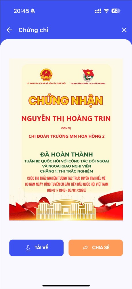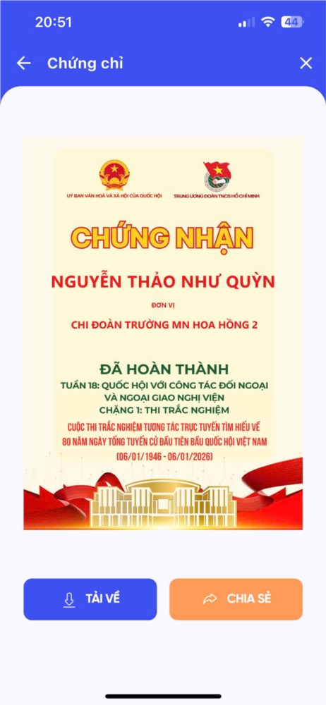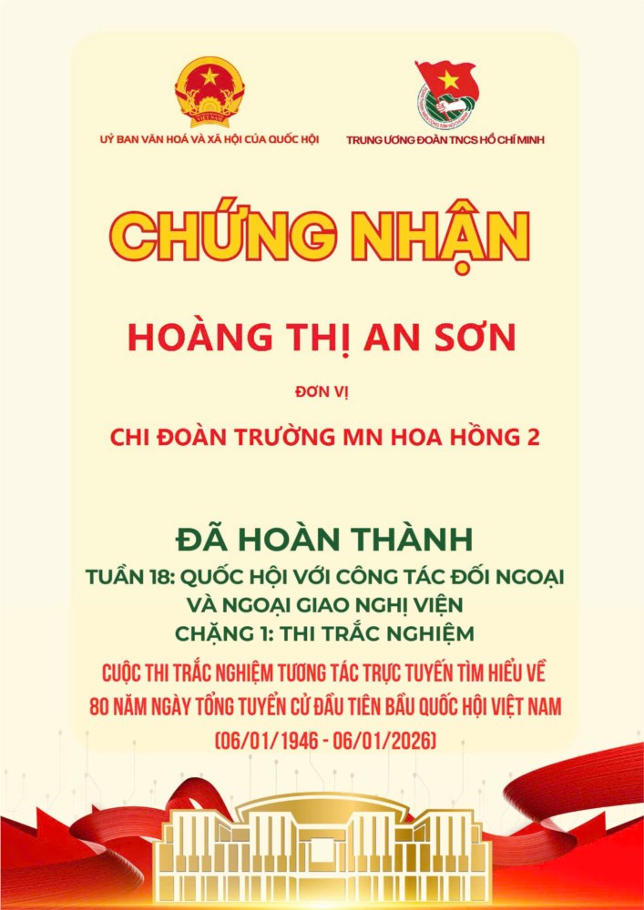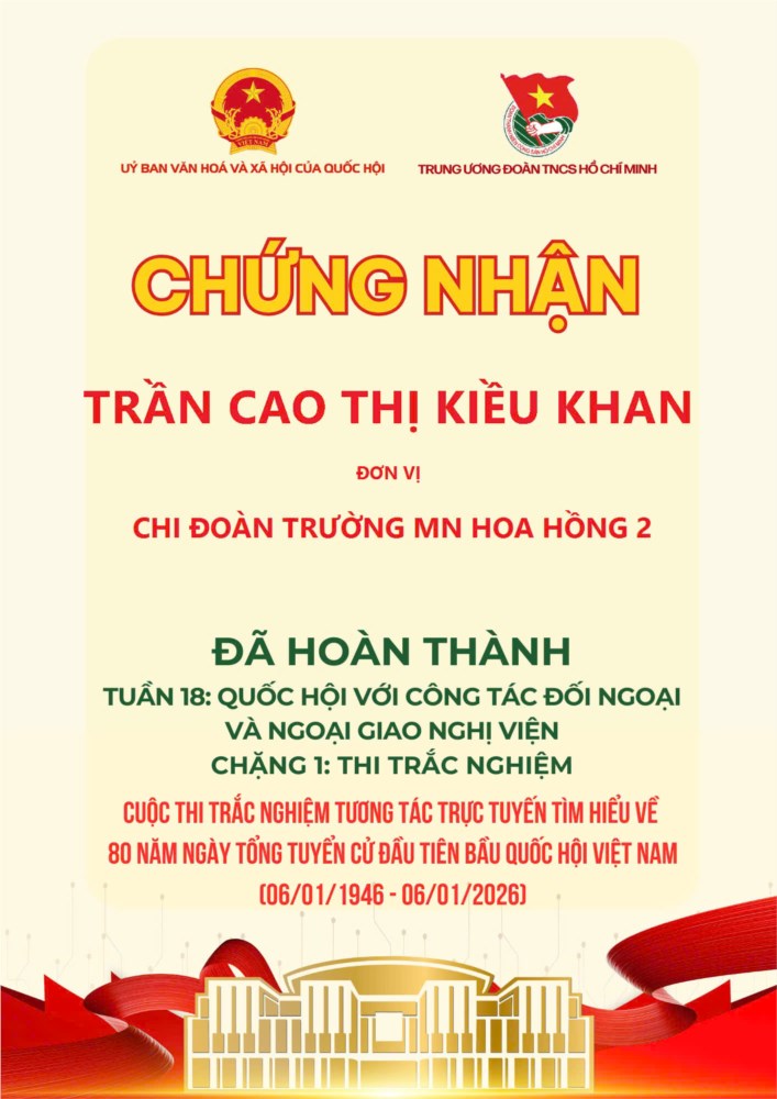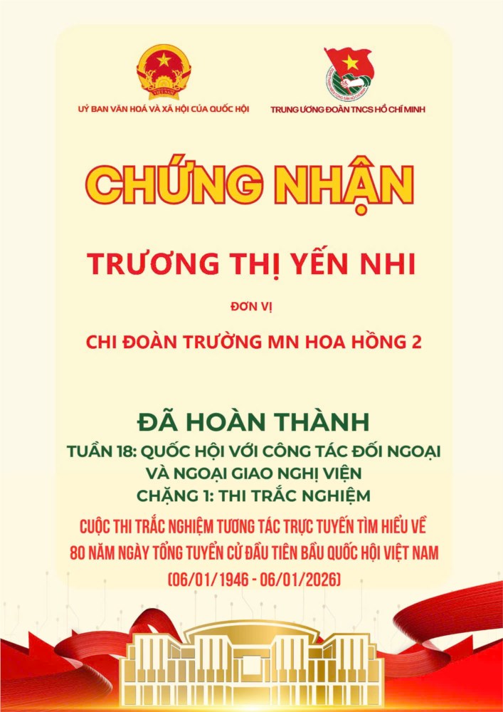 Với tinh thần đó, đoàn viên Chi đoàn đã tích cực tham gia Cuộc thi trắc nghiệm trực tuyến tìm hiểu về 80 năm Ngày Tổng tuyển cử đầu tiên bầu Quốc hội Việt Nam (06/01/1946 - 06/01/2026) – một dấu mốc lịch sử đặc biệt quan trọng, ghi nhận sự ra đời của cơ quan quyền lực cao nhất của Nhà nước ta.